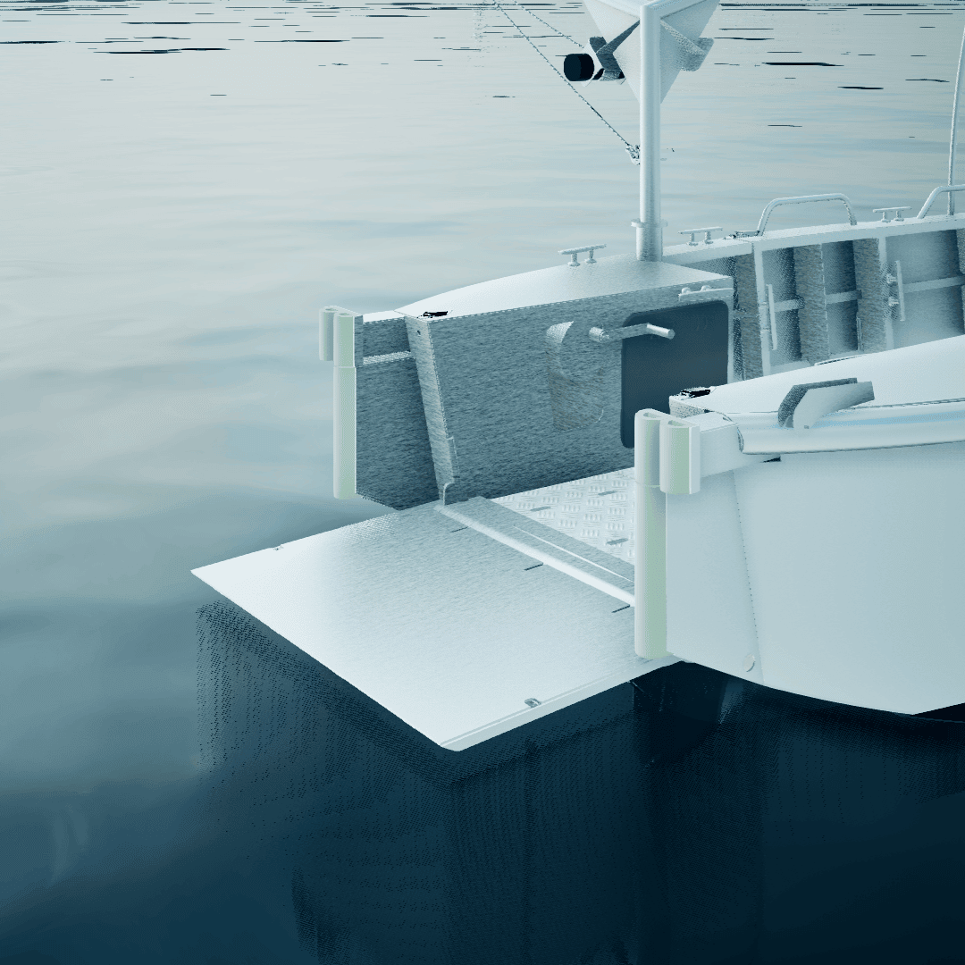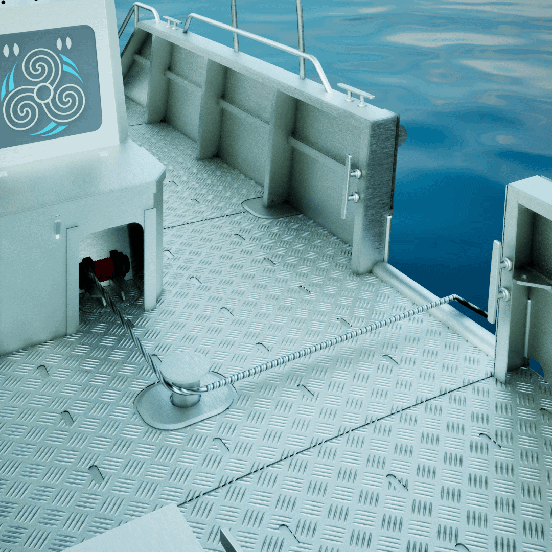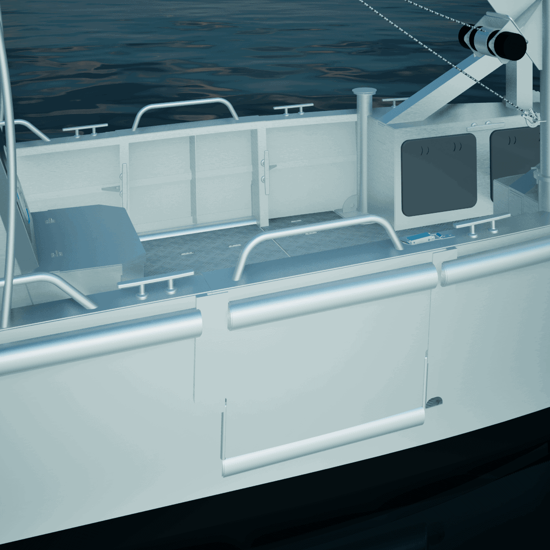 Une porte de pavois latérale entièrement démontable se trouve de chaque côté du navire pour faciliter l’accès à celui-ci et le chargement du matériel.